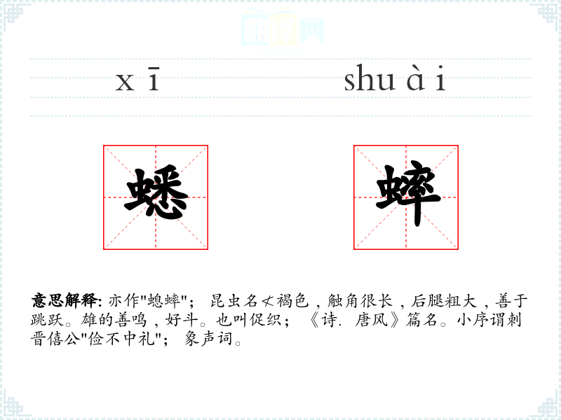 亦作"螅蟀"; 昆虫名≮褐色﹐触角很长﹐后腿粗大﹐善于跳跃。雄的善鸣﹐好斗。也叫促织; 《诗.唐风》篇名。小序谓刺晋僖公"