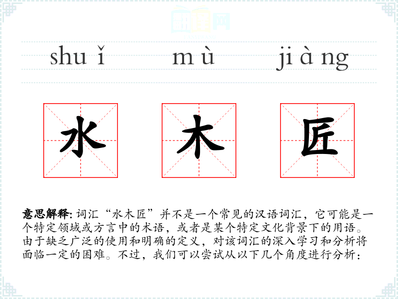 词汇“水木匠”并不是一个常见的汉语词汇,它可能是一个特定领域或方言中的术语,或者是某个特定文化背景下的用语。由于缺乏广泛的使用和明确的定义,对该词汇的深入学习和分析将面临一定的困难。不过,我们可以尝试从以下几个角度进行分析: