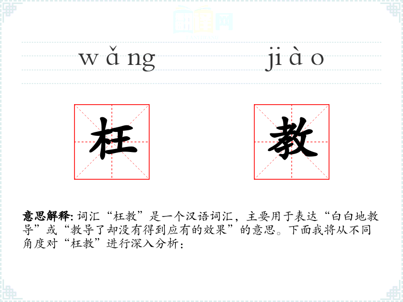 “枉教”一词源自古代汉语,其中“枉”字古已有之,意为弯曲、不直,引申为徒劳无功。随着语言的发展,“枉教”逐渐固定为表达教育无效的词汇。