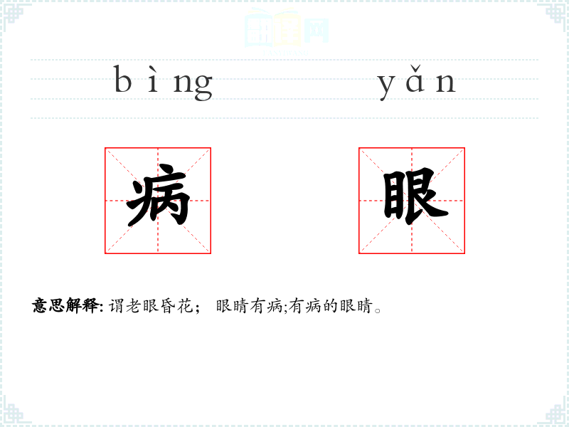 谓老眼昏花; 眼睛有病;有病的眼睛。