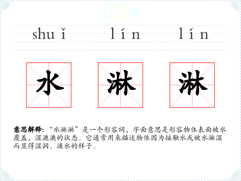 “水淋淋”是一个形容词,字面意思是形容物体表面被水覆盖,湿漉漉的状态。它通常用来描述物体因为接触水或被水淋湿而显得湿润、滴水的样子。
