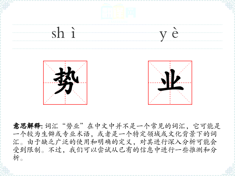词汇“势业”在中文中并不是一个常见的词汇,它可能是一个较为生僻或专业术语,或者是一个特定领域或文化背景下的词汇。由于缺乏广泛的使用和明确的定义,对其进行深入分析可能会受到限制。不过,我们可以尝试从已有的信息中进行一些推测和分析。