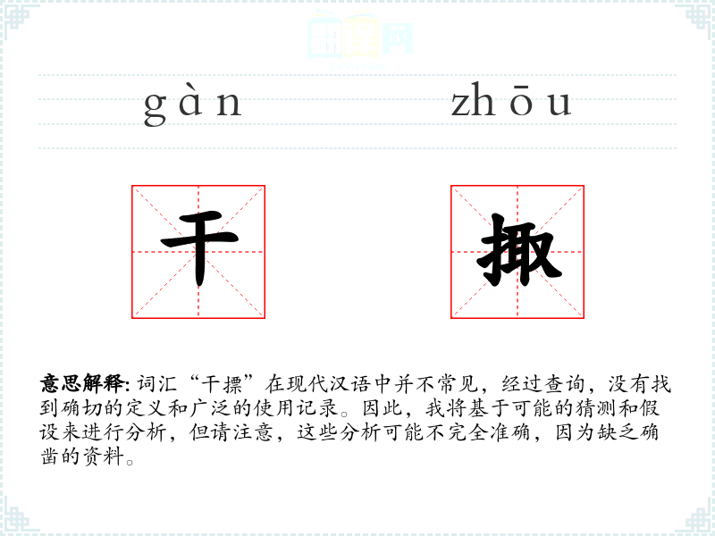 由于“干摽”不是一个标准的汉语词汇,我们无法提供一个确切的字面意思和基本含义。