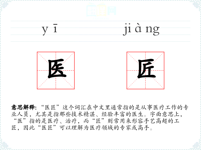 “医匠”这个词汇不仅代表了医疗专业人员的技能和经验,还承载了社会对他们的尊重和期待。在我的语言学*和表达中,这个词汇提醒我要尊重专业知识,同时也激励我追求卓越。