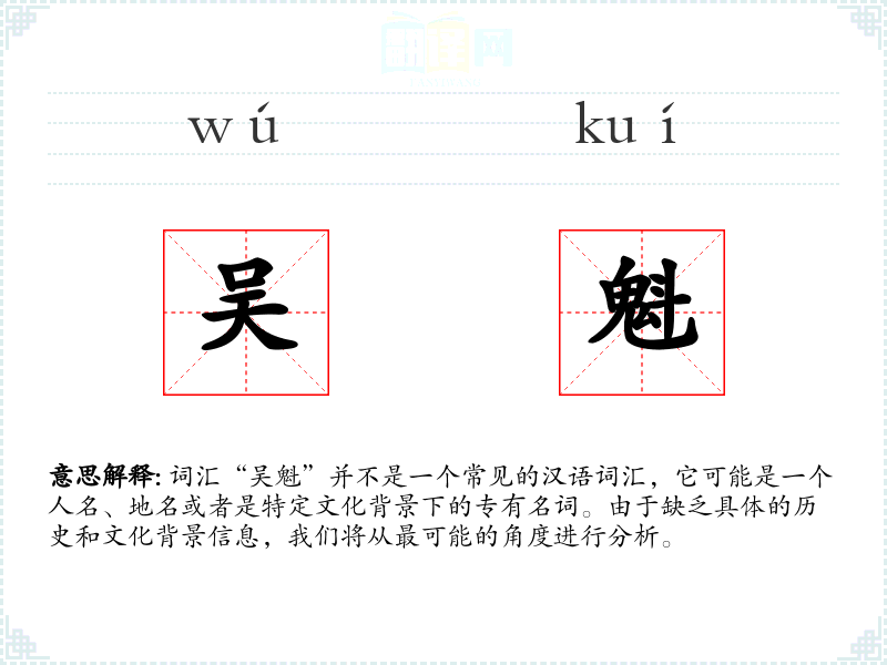 词汇“吴魁”并不是一个常见的汉语词汇,它可能是一个人名、地名或者是特定文化背景下的专有名词。由于缺乏具体的历史和文化背景信息,我们将从最可能的角度进行分析。