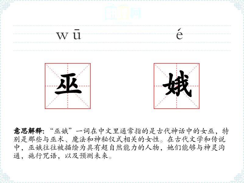 “巫娥”一词的词源可以追溯到古代汉语,其中“巫”指的是施行巫术的人,“娥”则常用来形容女性的美丽或优雅。随着时间的推移,这个词在文学和民间传说中逐渐固定下来,成为描述具有神秘能力的女性角色的专用词汇。