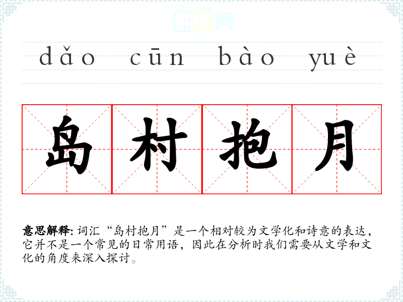 “岛村抱月”字面意思是指一个位于岛上的村庄,在夜晚怀抱着月亮。这个词汇通常用来描绘一种宁静、美丽而又略带孤寂的乡村景象。