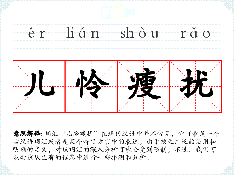 词汇“儿怜瘦扰”在现代汉语中并不常见,它可能是一个古汉语词汇或者是某个特定方言中的表达。由于缺乏广泛的使用和明确的定义,对该词汇的深入分析可能会受到限制。不过,我们可以尝试从已有的信息中进行一些推测和分析。