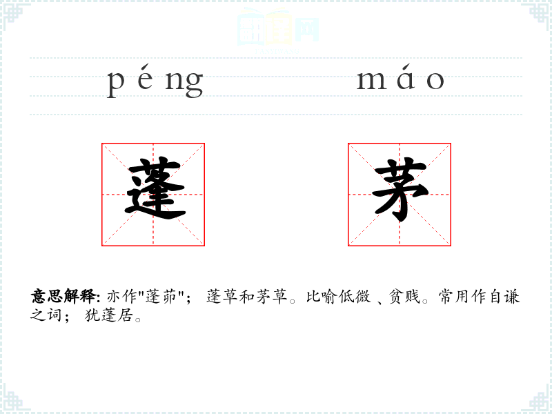 亦作"蓬茆"; 蓬草和茅草。比喻低微﹑贫贱。常用作自谦之词; 犹蓬居。