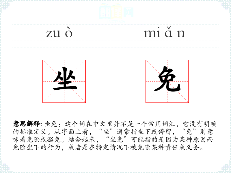在不同语言或文化中,可能没有与“坐免”直接对应的词汇。这个词的使用可能非常有限,且依赖于特定的语境。