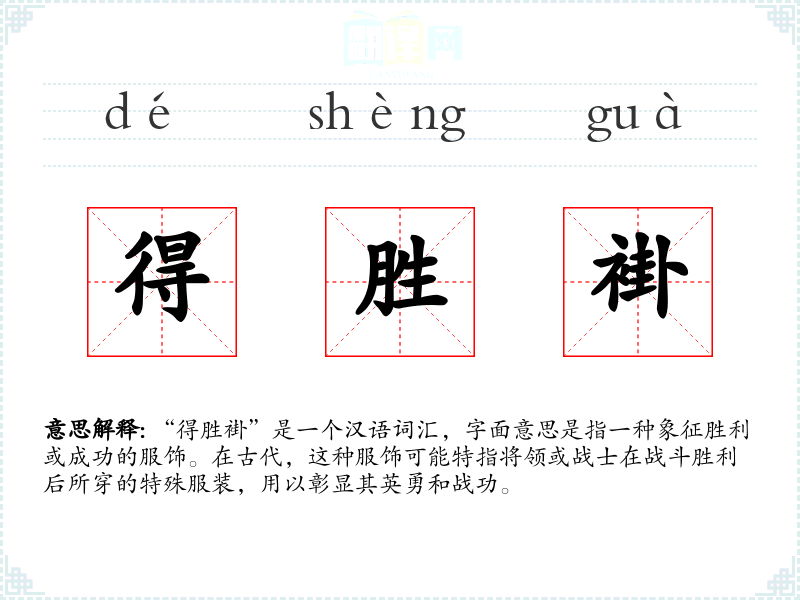 “得胜褂”是一个汉语词汇,字面意思是指一种象征胜利或成功的服饰。在古代,这种服饰可能特指将领或战士在战斗胜利后所穿的特殊服装,用以彰显其英勇和战功。