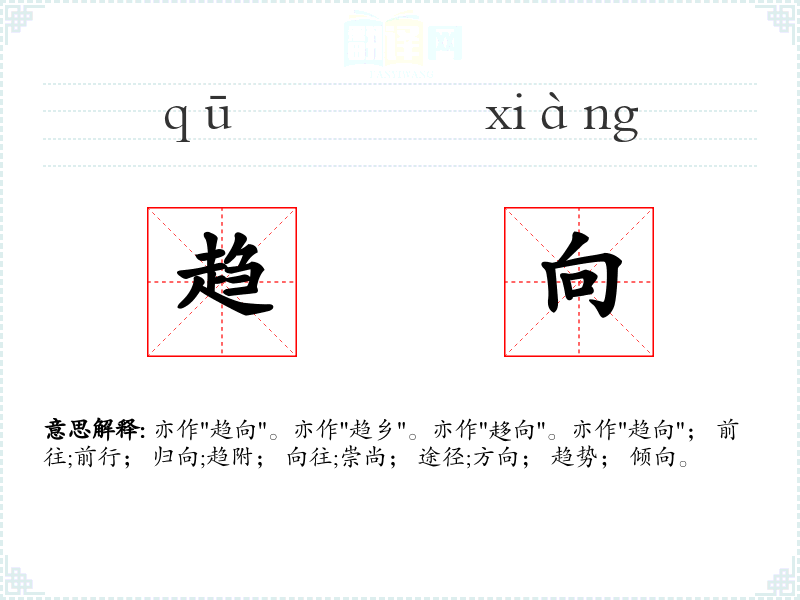 亦作"趋向"。亦作"趋乡"。亦作"趍向"。亦作"趋向"; 前往;前行; 归向;趋附; 向往;崇尚; 途径;方向; 趋势; 倾向。