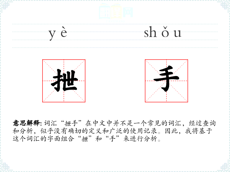 词汇“抴手”在中文中并不是一个常见的词汇,经过查询和分析,似乎没有确切的定义和广泛的使用记录。因此,我将基于这个词汇的字面组合“抴”和“手”来进行分析。