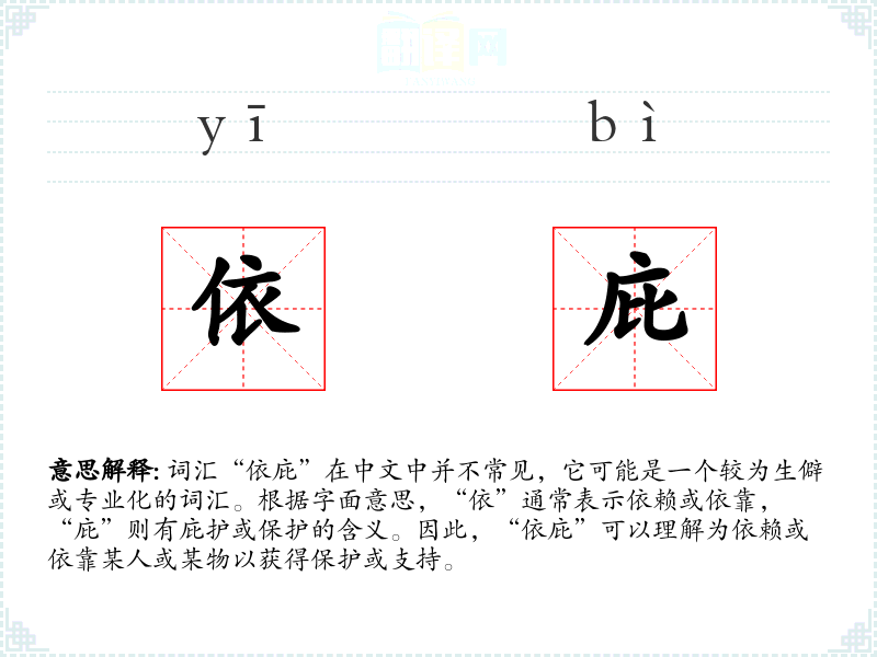 - 理解:“依庇”是一个表达依赖和寻求保护的词汇,虽然在日常口语中不常用,但在特定情境和文学作品中能够准确表达特定的情感和行为。