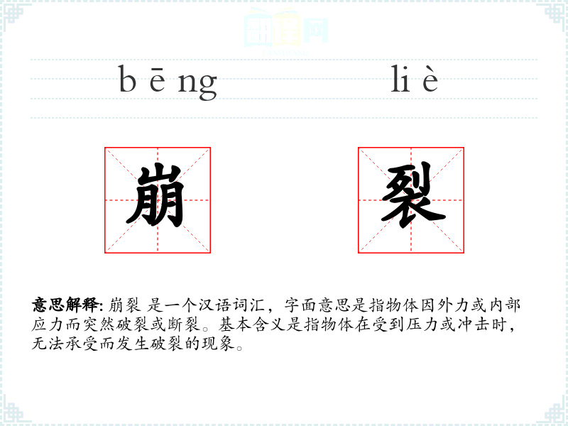 崩裂 是一个汉语词汇,字面意思是指物体因外力或内部应力而突然破裂或断裂。基本含义是指物体在受到压力或冲击时,无法承受而发生破裂的现象。