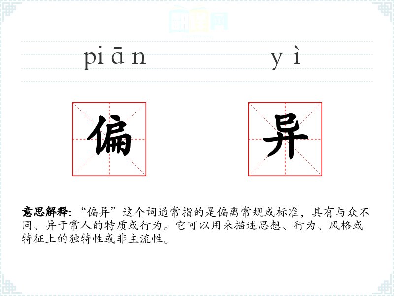 - 口语:在日常对话中,“偏异”可能带有贬义,指某人的行为或想法过于古怪或不合群。
