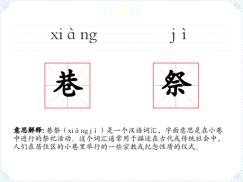 巷祭(xiàng jì)是一个汉语词汇,字面意思是在小巷中进行的祭祀活动。这个词汇通常用于描述在古代或传统社会中,人们在居住区的小巷里举行的一些**或纪念性质的仪式。