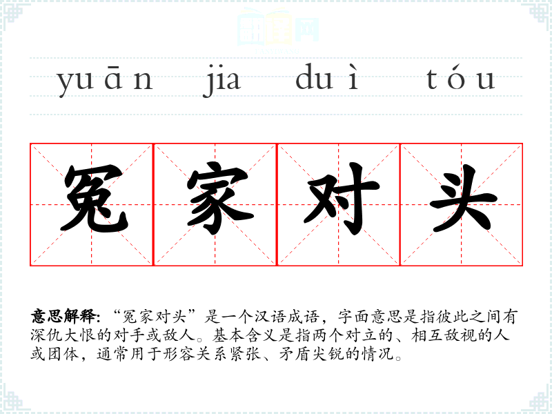 “冤家对头”是一个汉语成语,字面意思是指彼此之间有深仇大恨的对手或敌人。基本含义是指两个对立的、相互敌视的人或团体,通常用于形容关系紧张、矛盾尖锐的情况。
