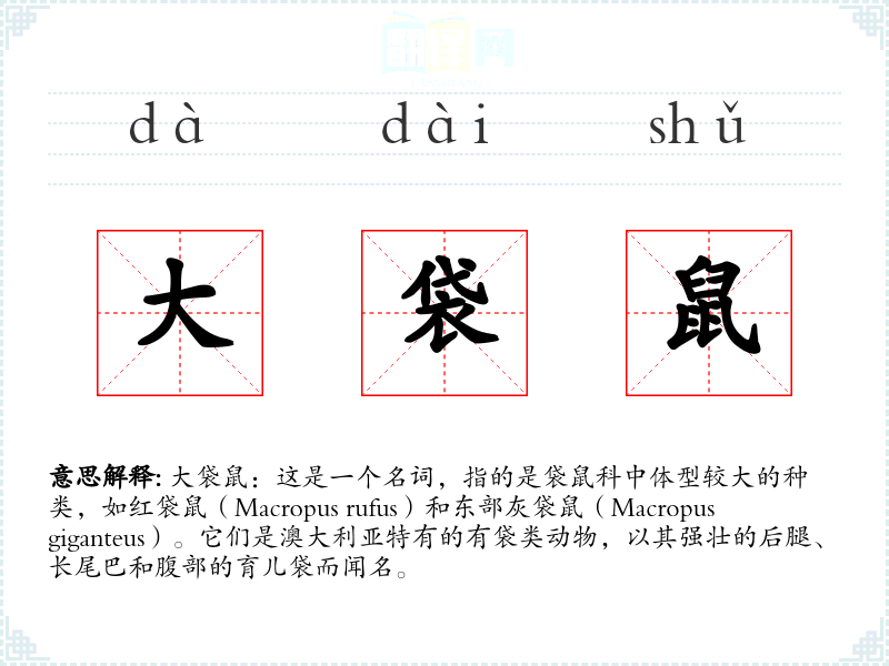 大袋鼠:这是一个名词,指的是袋鼠科中体型较大的种类,如红袋鼠(Macropus rufus)和东部灰袋鼠(Macropus giganteus)。它们是澳大利亚特有的有袋类动物,以其强壮的后腿、长尾巴和腹部的育儿袋而闻名。