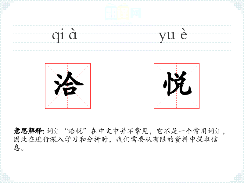 词汇“洽悦”在中文中并不常见,它不是一个常用词汇,因此在进行深入学*和分析时,我们需要从有限的资料中提取信息。