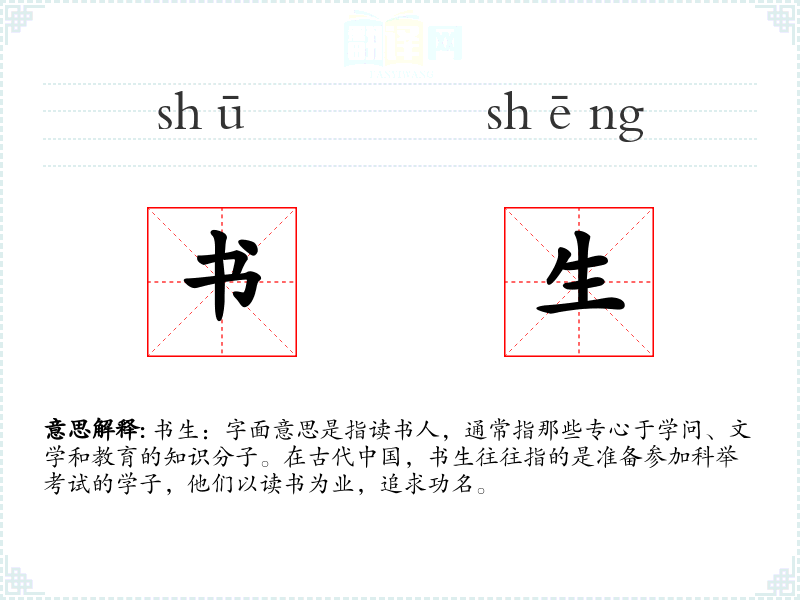 书生:字面意思是指读书人,通常指那些专心于学问、文学和教育的知识分子。在古代中国,书生往往指的是准备参加科举考试的学子,他们以读书为业,追求功名。
