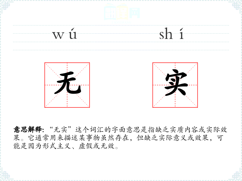 “无实”这个词汇的字面意思是指缺乏实质内容或实际效果。它通常用来描述某事物虽然存在,但缺乏实际意义或效果,可能是因为形式主义、虚假或无效。