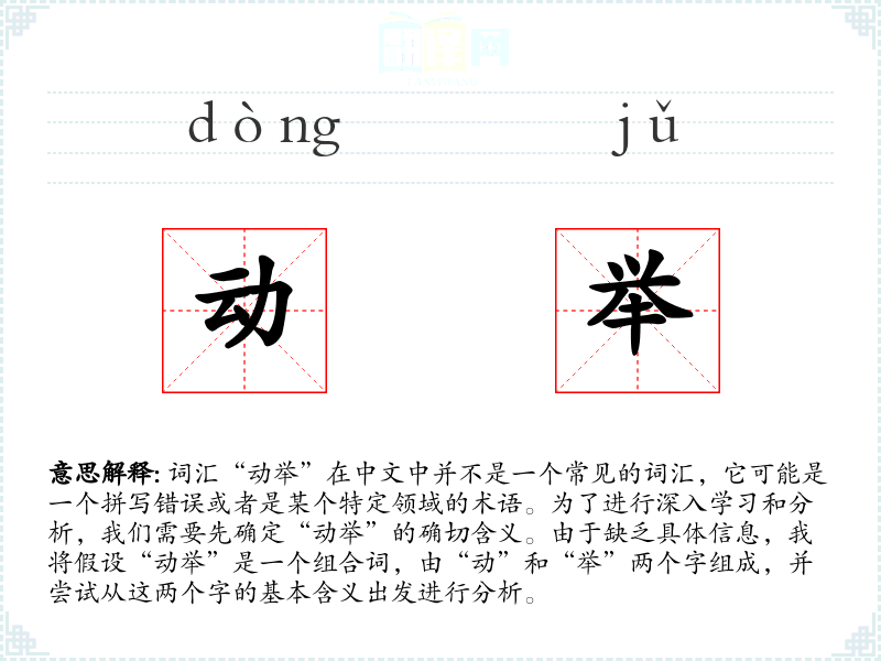 综上所述,由于“动举”不是一个标准词汇,很难进行深入学*和分析。如果它是一个特定领域的术语,可能需要查阅相关的专业文献或手册。