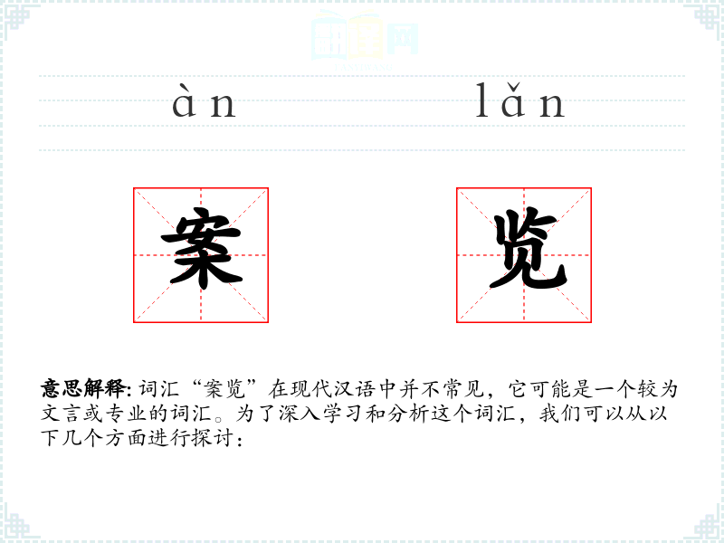词汇“案览”在现代汉语中并不常见,它可能是一个较为文言或专业的词汇。为了深入学*和分析这个词汇,我们可以从以下几个方面进行探讨: