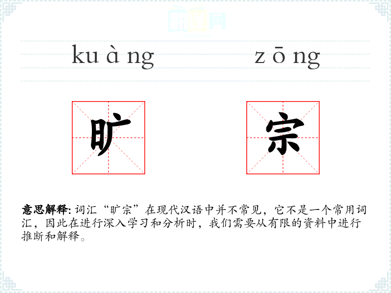 词汇“旷宗”在现代汉语中并不常见,它不是一个常用词汇,因此在进行深入学*和分析时,我们需要从有限的资料中进行推断和解释。