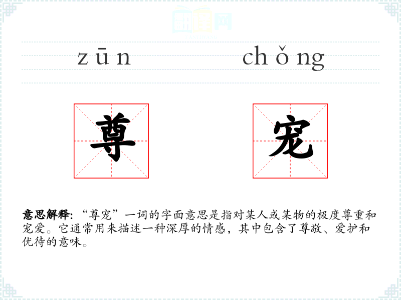 “尊宠”一词的字面意思是指对某人或某物的极度尊重和宠爱。它通常用来描述一种深厚的情感,其中包含了尊敬、爱护和优待的意味。