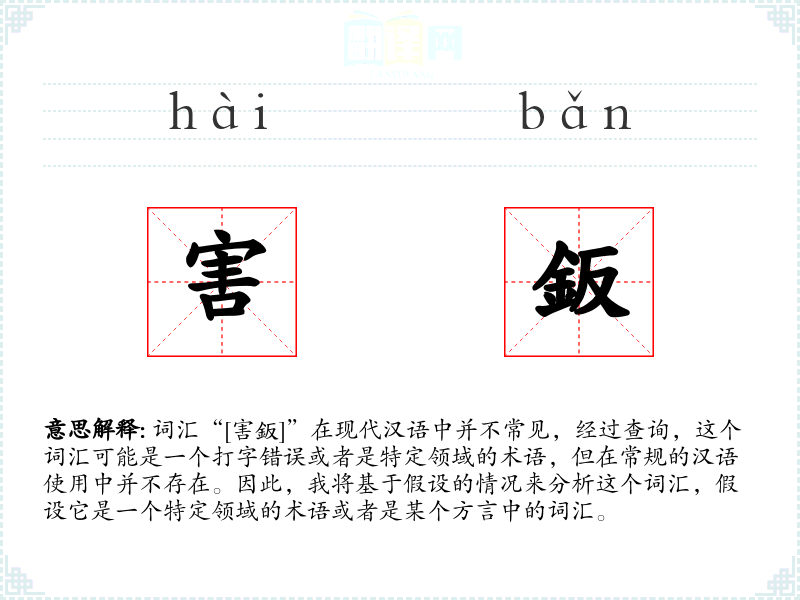 词汇“[害鈑]”在现代汉语中并不常见,经过查询,这个词汇可能是一个打字错误或者是特定领域的术语,但在常规的汉语使用中并不存在。因此,我将基于假设的情况来分析这个词汇,假设它是一个特定领域的术语或者是某个方言中的词汇。