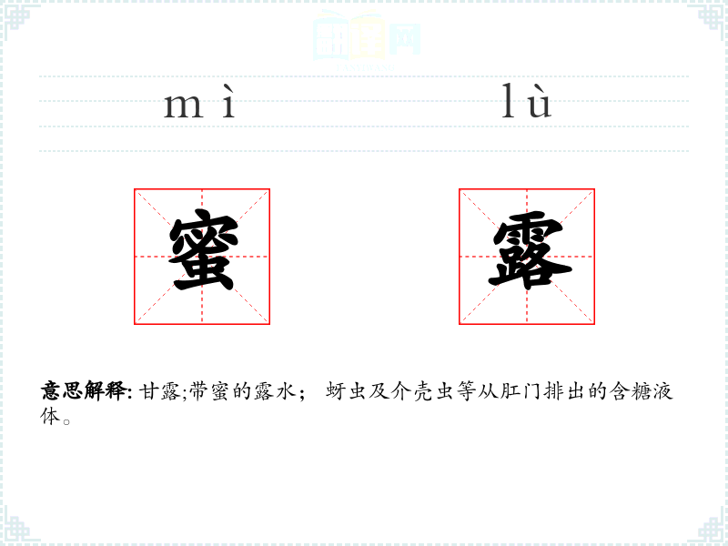 甘露;带蜜的露水; 蚜虫及介壳虫等从肛门排出的含糖液体。