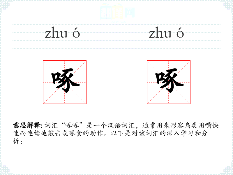 词汇“啄啄”是一个汉语词汇,通常用来形容鸟类用嘴快速而连续地敲击或啄食的动作。以下是对该词汇的深入学*和分析: