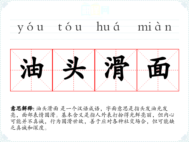 油头滑面 是一个汉语成语,字面意思是指头发油光发亮,面部表情圆滑。基本含义是指人外表打扮得光鲜亮丽,但内心可能并不真诚,行为圆滑世故,善于应对各种社交场合,但可能缺乏真诚和深度。