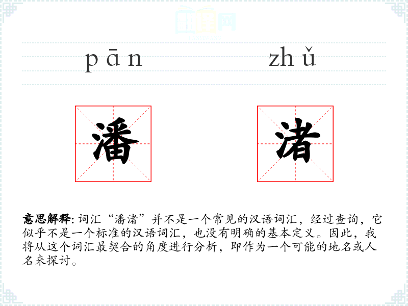 由于“潘渚”不是一个标准词汇,我们无法给出确切的基本定义。它可能是某个地方的名称,或者是某个人的名字。