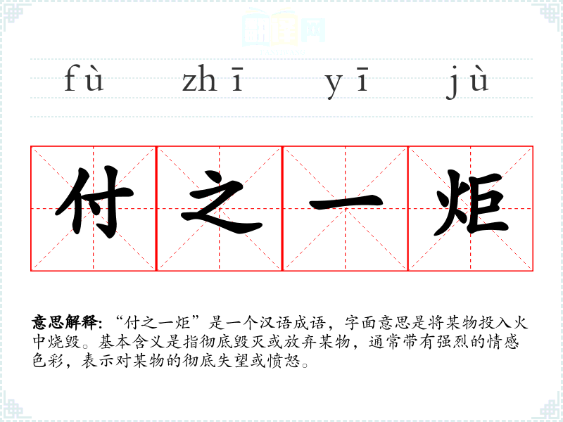 “付之一炬”是一个汉语成语,字面意思是将某物投入火中烧毁。基本含义是指彻底毁灭或放弃某物,通常带有强烈的情感色彩,表示对某物的彻底失望或愤怒。