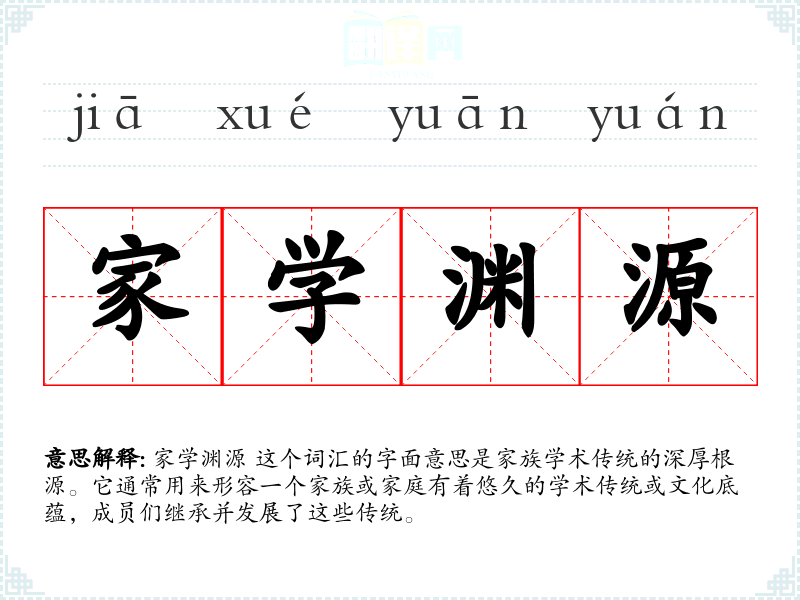 家学渊源 这个词汇的字面意思是家族学术传统的深厚根源。它通常用来形容一个家族或家庭有着悠久的学术传统或文化底蕴,成员们继承并发展了这些传统。