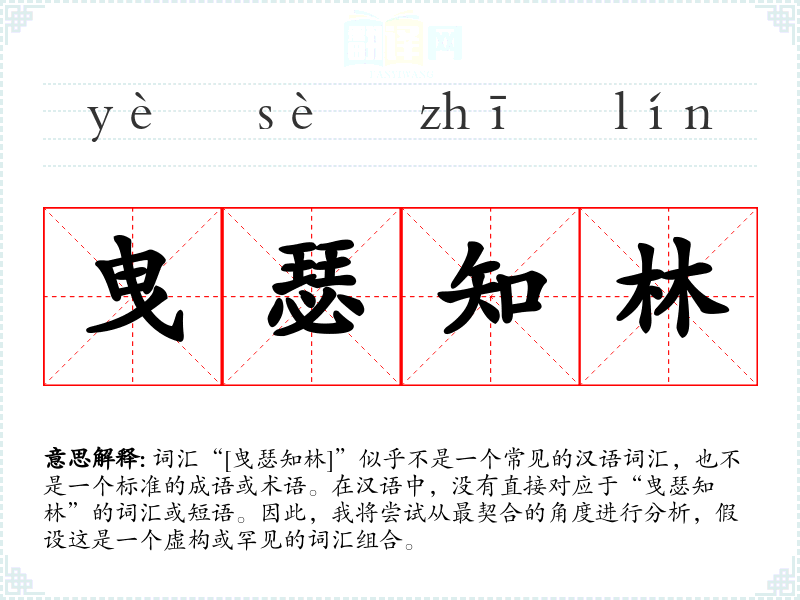 词汇“[曳瑟知林]”似乎不是一个常见的汉语词汇,也不是一个标准的成语或术语。在汉语中,没有直接对应于“曳瑟知林”的词汇或短语。因此,我将尝试从最契合的角度进行分析,假设这是一个虚构或罕见的词汇组合。