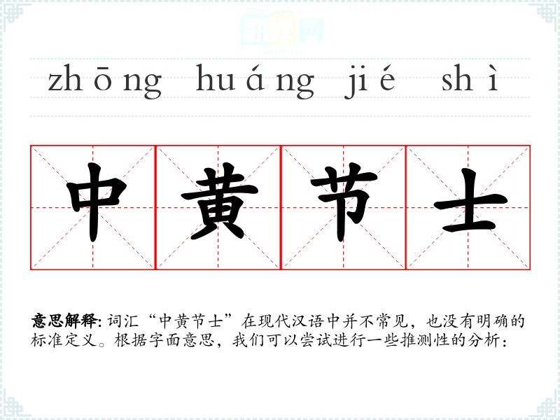 词汇“中黄节士”在现代汉语中并不常见,也没有明确的标准定义。根据字面意思,我们可以尝试进行一些推测性的分析: