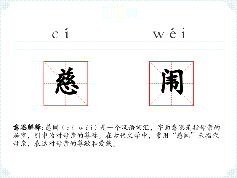 “慈阃”一词源自古代汉语,其中“慈”意为慈爱,“阃”原指门槛或内室,后引申为家庭内部,特别是指母亲的居所。随着语言的发展,“慈阃”逐渐固定为对母亲的尊称。