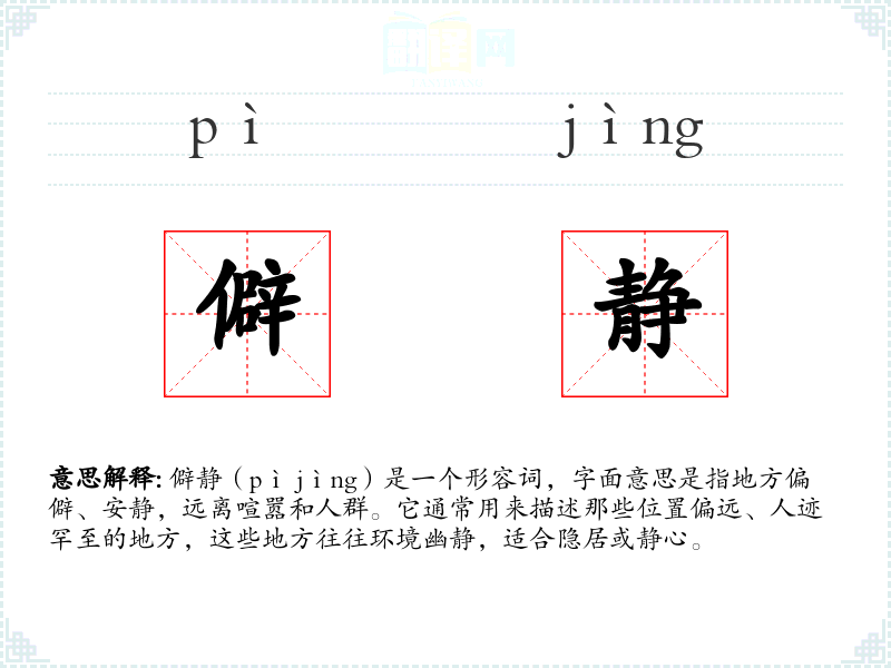 僻静(pì jìng)是一个形容词,字面意思是指地方偏僻、安静,远离喧嚣和人群。它通常用来描述那些位置偏远、人迹罕至的地方,这些地方往往环境幽静,适合隐居或静心。
