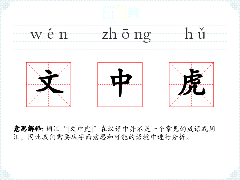 词汇“[文中虎]”在汉语中并不是一个常见的成语或词汇,因此我们需要从字面意思和可能的语境中进行分析。