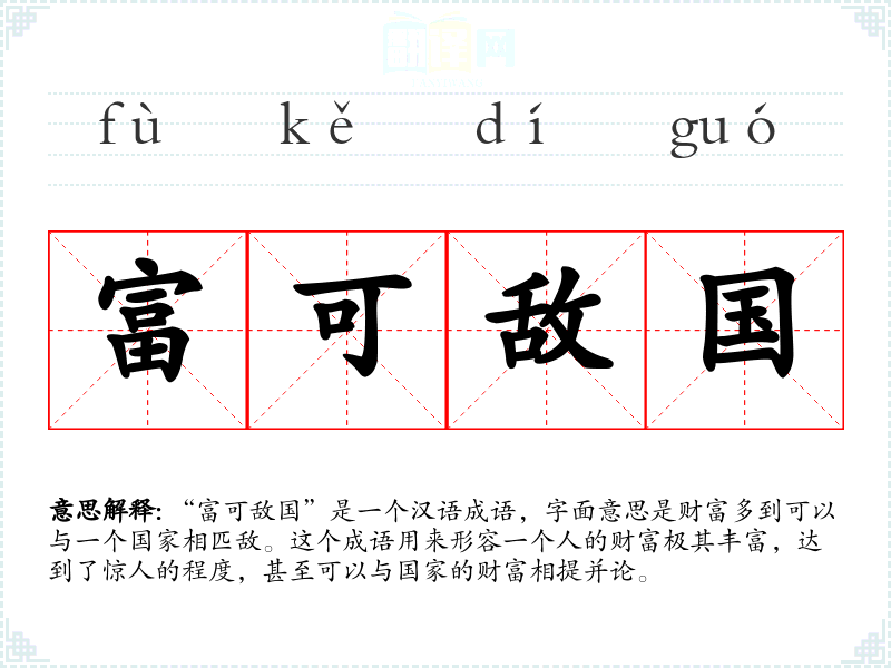 “富可敌国”是一个汉语成语,字面意思是财富多到可以与一个国家相匹敌。这个成语用来形容一个人的财富极其丰富,达到了惊人的程度,甚至可以与国家的财富相提并论。