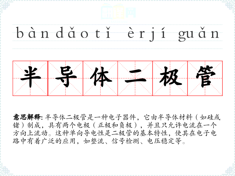 在不同语言中,“半导体二极管”通常有相似的翻译,如在德语中为“Halbleiterdiode”,在法语中为“diode à semi-conducteur”,显示了其在国际科技交流中的通用性。