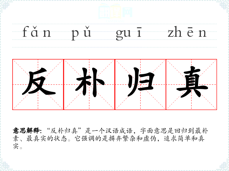 “反朴归真”是一个汉语成语,字面意思是回归到最朴素、最真实的状态。它强调的是摒弃繁杂和虚伪,追求简单和真实。