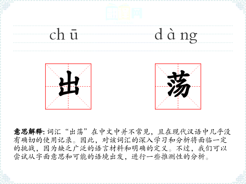 “出荡”由两个汉字组成:“出”意味着离开、出现或超出,而“荡”通常指摇动、摆动或清除。结合起来,“出荡”可能意味着某种形式的移动、摇摆或清除过程。
