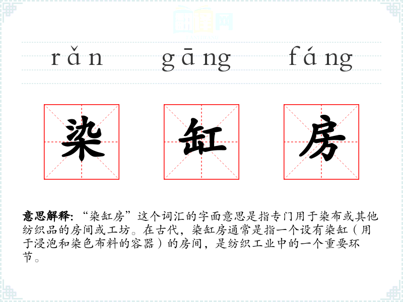 “染缸房”这个词汇的字面意思是指专门用于染布或其他纺织品的房间或工坊。在古代,染缸房通常是指一个设有染缸(用于浸泡和染色布料的容器)的房间,是纺织工业中的一个重要环节。