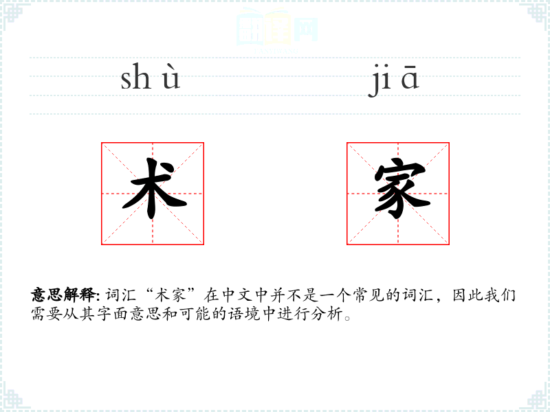 “术家”可以理解为精通某种技艺或学术的人,特别是那些在某一领域有深厚造诣的专家或学者。这个词汇可能源自于“术”字,指的是技艺、方法或学术,而“家”则指的是人或专家。