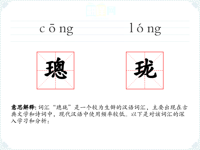 词汇“璁珑”是一个较为生僻的汉语词汇,主要出现在古典文学和诗词中,现代汉语中使用频率较低。以下是对该词汇的深入学*和分析: