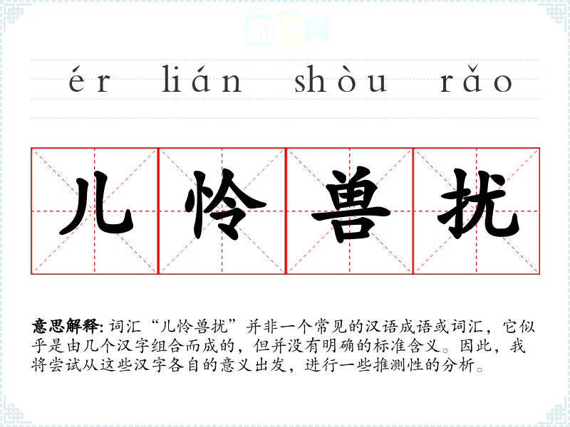 词汇“儿怜兽扰”并非一个常见的汉语成语或词汇,它似乎是由几个汉字组合而成的,但并没有明确的标准含义。因此,我将尝试从这些汉字各自的意义出发,进行一些推测性的分析。